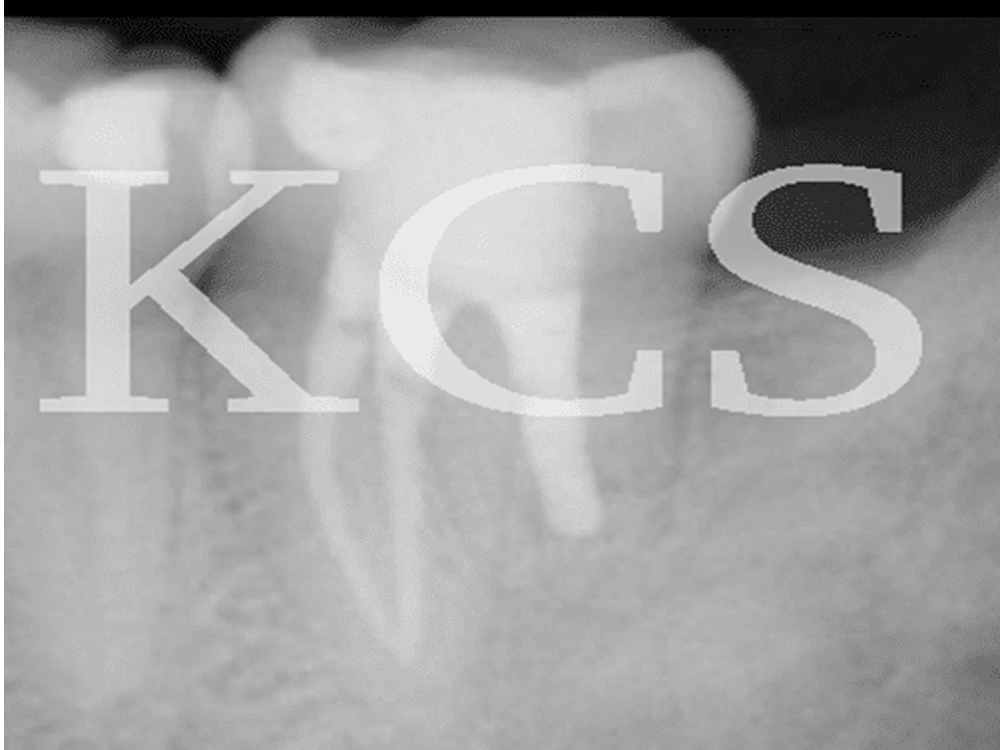På röntgen kan man se skadans utbredning, som har karierat tanden inifrån.