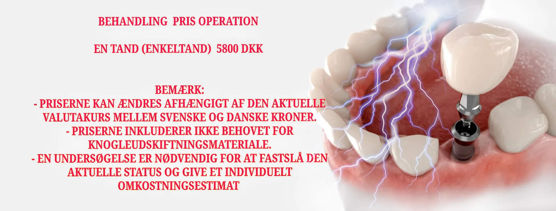 Bemærk: Priserne kan variere afhængigt af valutakursen mellem SEK og DKK og inkluderer ikke knogleudskiftningsmaterialer. En konsultation er nødvendig for at fastslå dine specifikke behov.